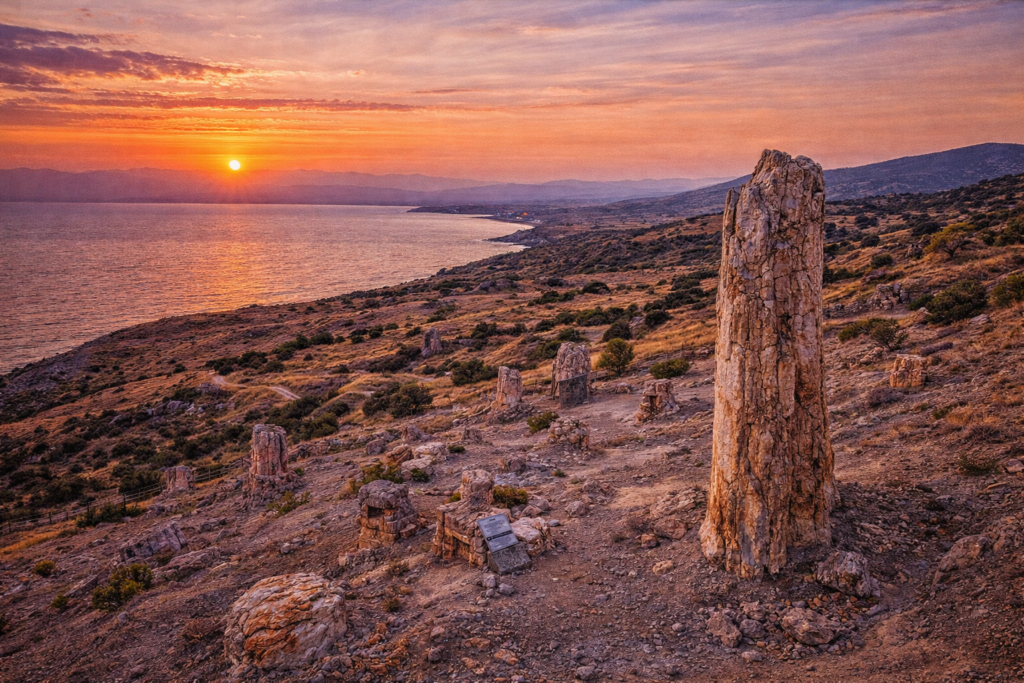 Το Απολιθωμένο Δάσος της Λέσβου είναι ένα μοναδικό φυσικό μνημείο παγκόσμιας σημασίας και βρίσκεται στη δυτική πλευρά του νησιού, κοντά στο Σίγρι. Δημιουργήθηκε πριν από περίπου 20 εκατομμύρια χρόνια, όταν η ηφαιστειακή δραστηριότητα κάλυψε τα δέντρα της περιοχής με στάχτη και λάβα, διατηρώντας τα απολιθωμένα μέχρι σήμερα. Η περιοχή αποτελεί προστατευόμενο γεωπάρκο της UNESCO και φιλοξενεί εντυπωσιακούς απολιθωμένους κορμούς δέντρων. Με ιδιαίτερη γεωλογική αξία και μοναδικό τοπίο, το Απολιθωμένο Δάσος αποτελεί ένα από τα σημαντικότερα αξιοθέατα της Λέσβου.